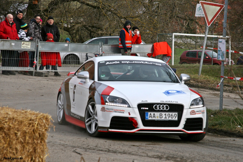 Die Gerhard-Mitter Gedächtnisrallye Calw war der erste Rollout für den neuen Audi TT RS. Eigentlich sollte es nur eine Testfahrt für die Saison 2013 werden - das Auto mal ein bischen Rallyeluft schnuppern lassen, der erste zaghafte Kontakt mit feinem Schotter, zügig durch die Kurven brettern um das Fahrwerk zu testen- doch der nach dem Gruppe G Reglement aufgebauten Bollide machte auf den abgesperrten Wertungsprüfungen so viel Spaß, daß an Zurückhaltung garnicht zu denken. Um einen Wimpernschlag verpassten die Fruck-Brüder den Gruppen- und Klassensieg. Nur 0,6 Sekunden trennte das Team bei Ihrer Einstandsrallye vom obersten Podestplatz.Ergebnis: 2. Platz in Klasse, 2. Platz in der Gruppe, 8. Gesamtrang - toller Einstieg!